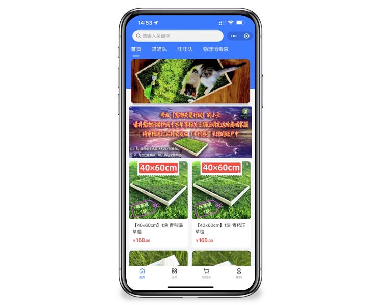 青毡商城,是新一代的优质宠物用品的网络商城,通过周期订购的方式,为喵星和汪星提供高质量的草毯,从而提高宠物的生活品质。在这个案例中,与青毡商城的深度融合,提供了宠物用品商城的全⾯技术⽀撑,目前易族仍持续为该商城服务。
